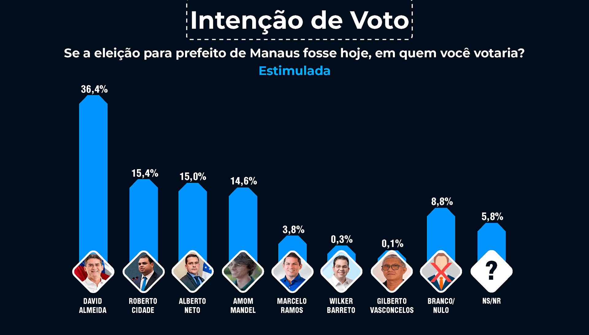 No cenário estimulado, David Almeida tem vaga garantida no segundo turno com 36,4% das intenções de voto, em um segundo grupo disputando a vaga no segundo turno, vem Roberto Cidade que obteve 15,4% das intenções de voto, seguido por Alberto Neto com 15,0% e Amo Mandel com 14,6%. Marcelo Ramos está em quinto lugar com 3,8%, seguido por Wilker Barreto com 0,3% e Gilberto Vasconcelos com 0,1%. Os eleitores que declararam votar em branco ou nulo somam 5,8% e indecisos 8,8%.