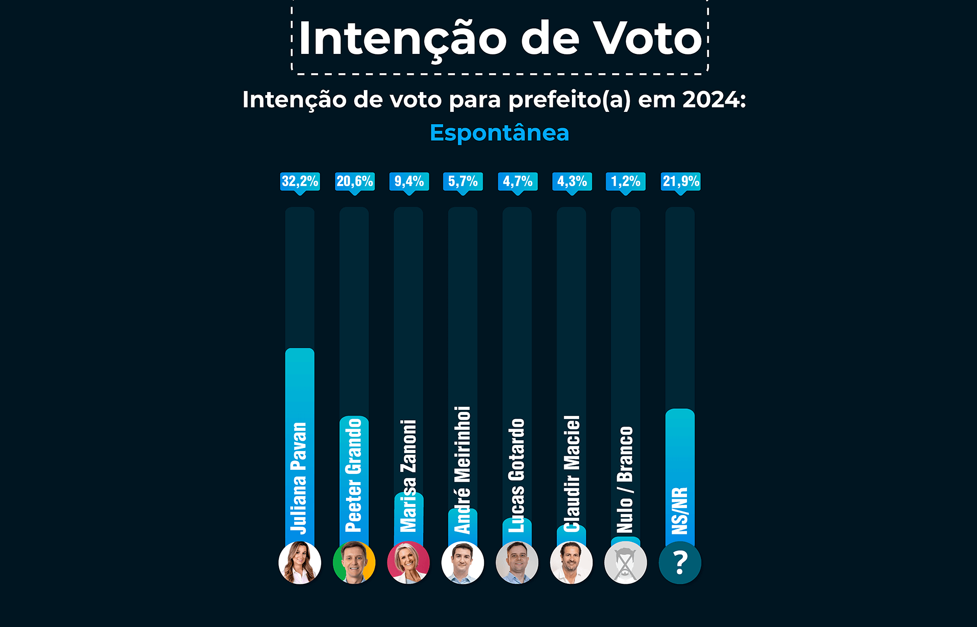 No cenário espontâneo Juliana Pavan lidera as intenções de voto para prefeita em Balneário Camboriú com 32,2% das intenções de voto, seguida por Peeter Grando com 20,6%, Marisa Zanoni 9,4%, André Meirinhoi com 5,7%, Lucas Gotardo 4,7% e Claudir Maciel 4,3%, 21,9% afirmaram não saber ou não terem decidido seu voto e 1,2% declararam não votar em Branco/Nenhum.