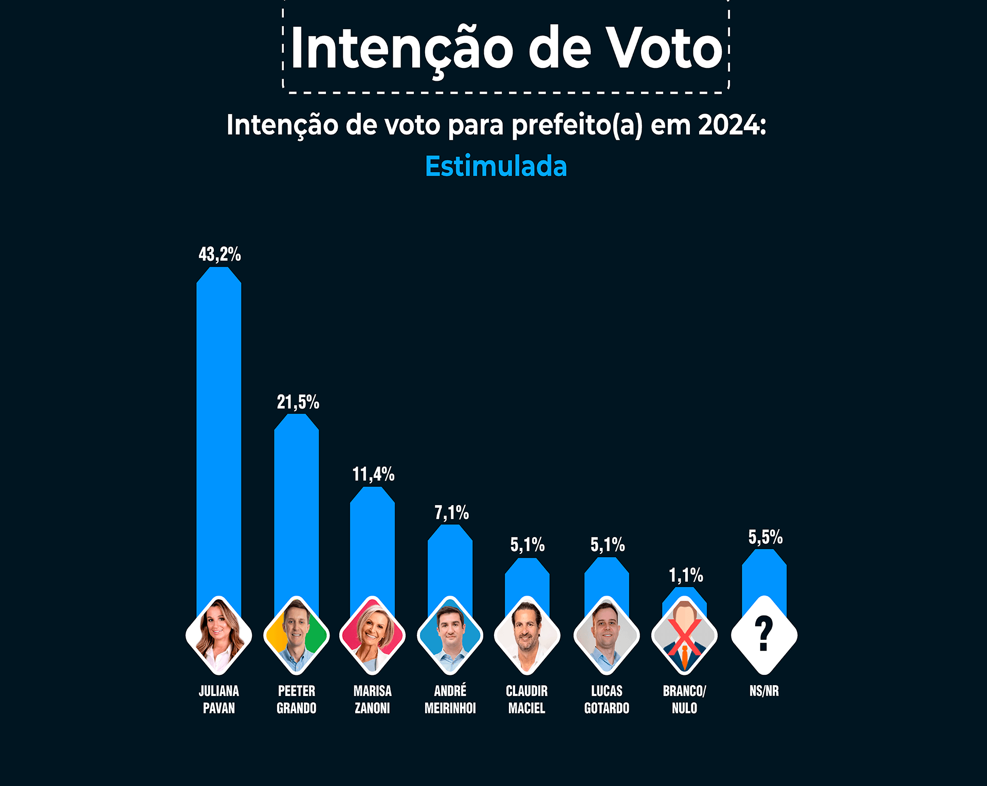 No cenário estimulado, Juliana Pavan aparece com 43,2% das intenções de voto, Peeter Grando tem 21,5%, Marisa Zanoni 11,4%, André Meirinhoi tem 7,1%, Lucas Gotardo e Claudir Maciel estão empatados com 5,1% das intenções de voto, 5,5% afirmaram não saber ou não terem decidido seu voto e 1,1% declararam não votar em Branco/Nenhum.