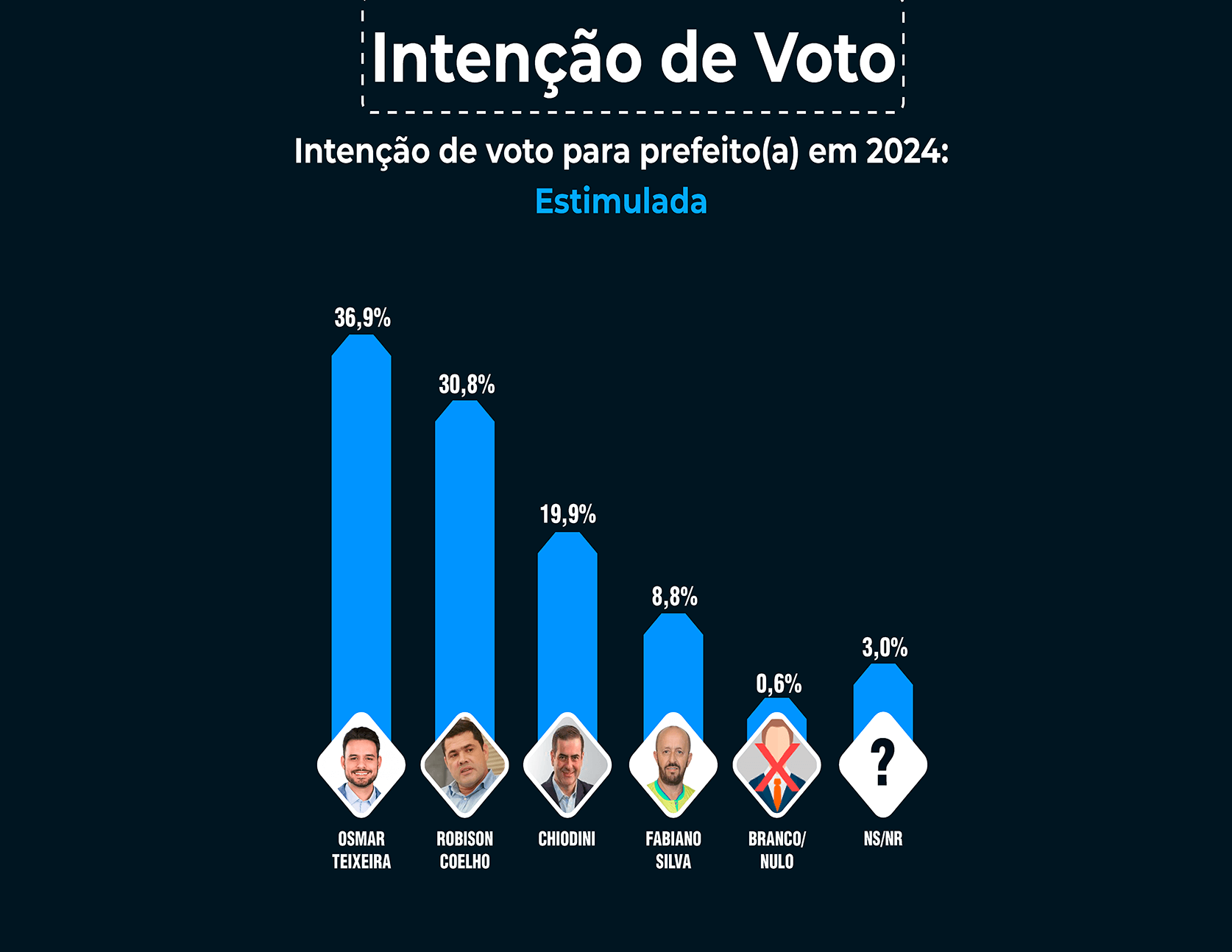 No cenário estimulado, Osmar Teixeira tem 36,9%% das intenções de voto, seguido por Robson Coelho com 30,8%, Chiodini aparece com 19,9% e  Fabiano Silva com 8,8%. Brancos e nulo somam 0,6% e os que não sabe/não respondeu somam 3,0%.