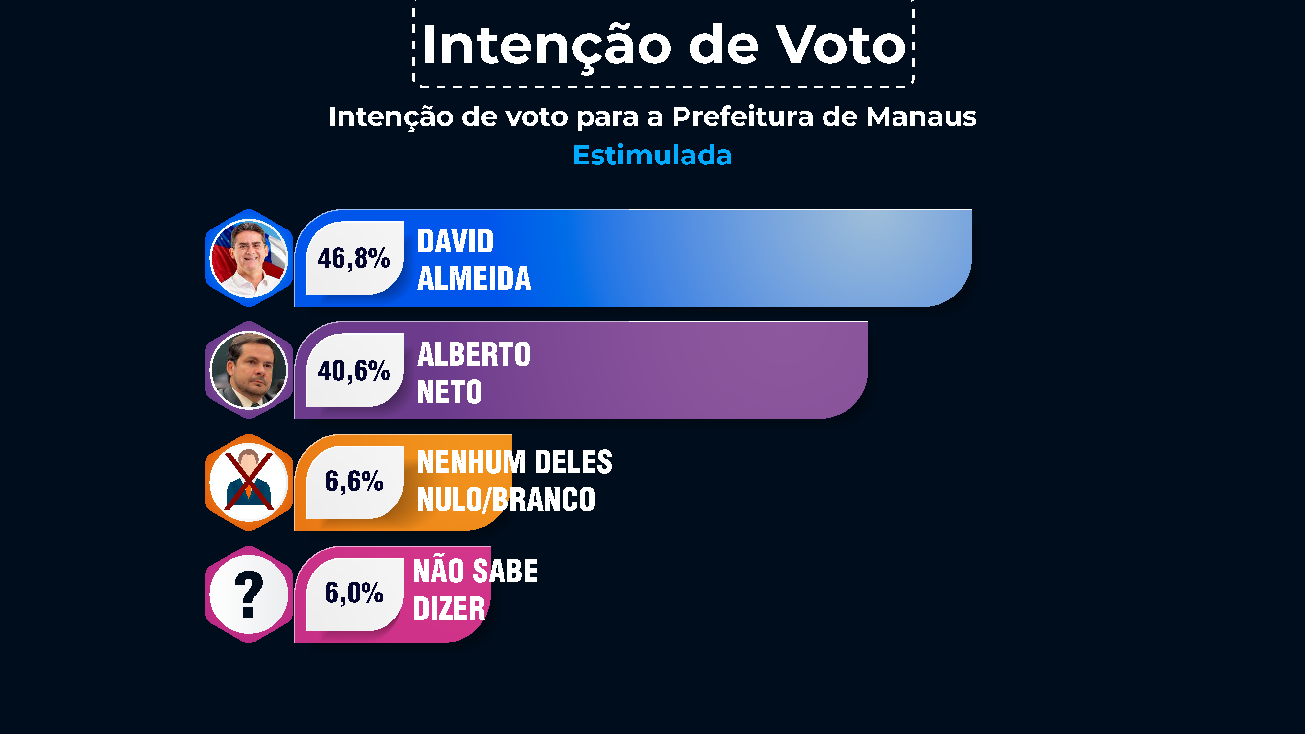 O atual prefeito de Manaus David Almeida, permanece na liderança da disputa para a prefeitura de Manaus na terceira pesquisa da Eficaz para o segundo turno das eleições 2024. No cenário estimulado, David Almeida (Avante) aparece com 46,8% das intenções de voto, enquanto o capitão Alberto Neto (PL) tem 40,6% da preferência do eleitor, branco e nulo somaram 6,6% e 6,0% não souberam dizer.