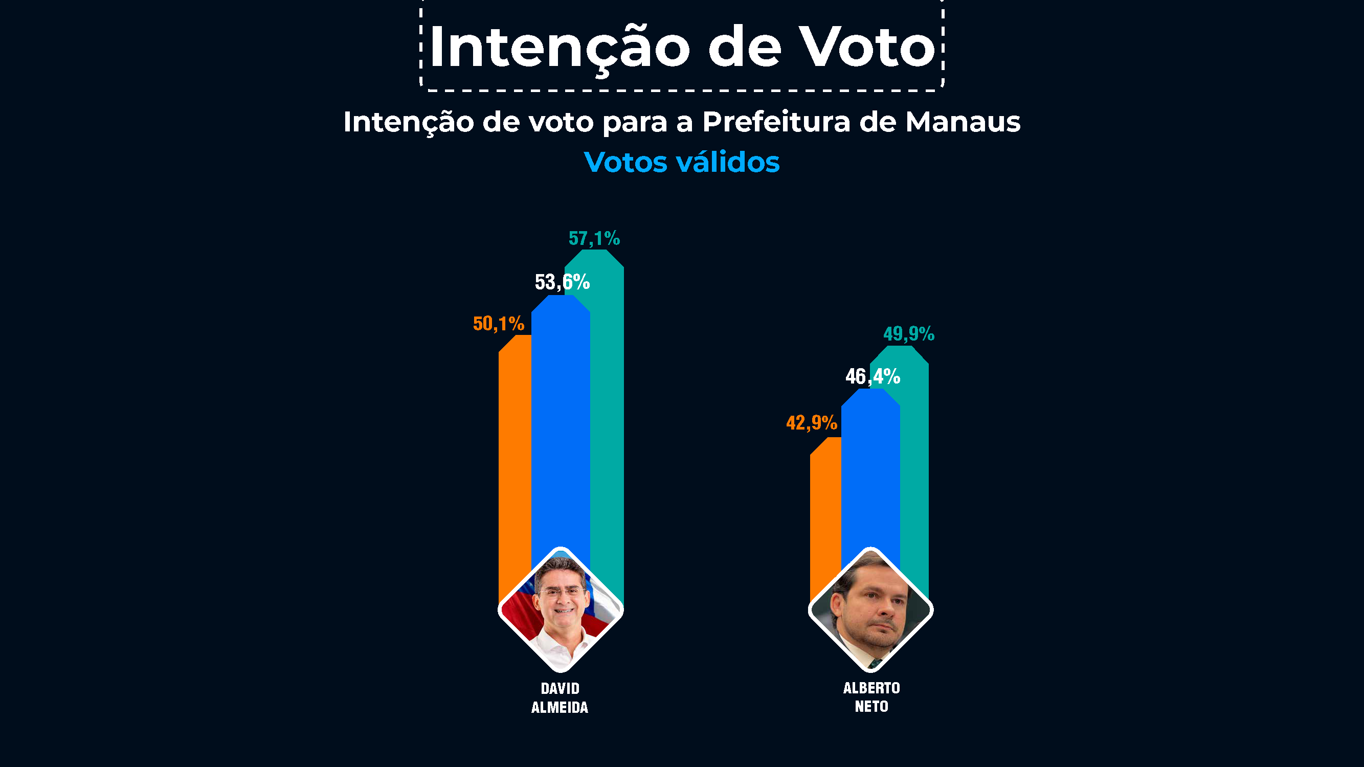 Considerando apenas os votos válidos, David Almeida tem 53,6% e Alberto Neto 46,4%.